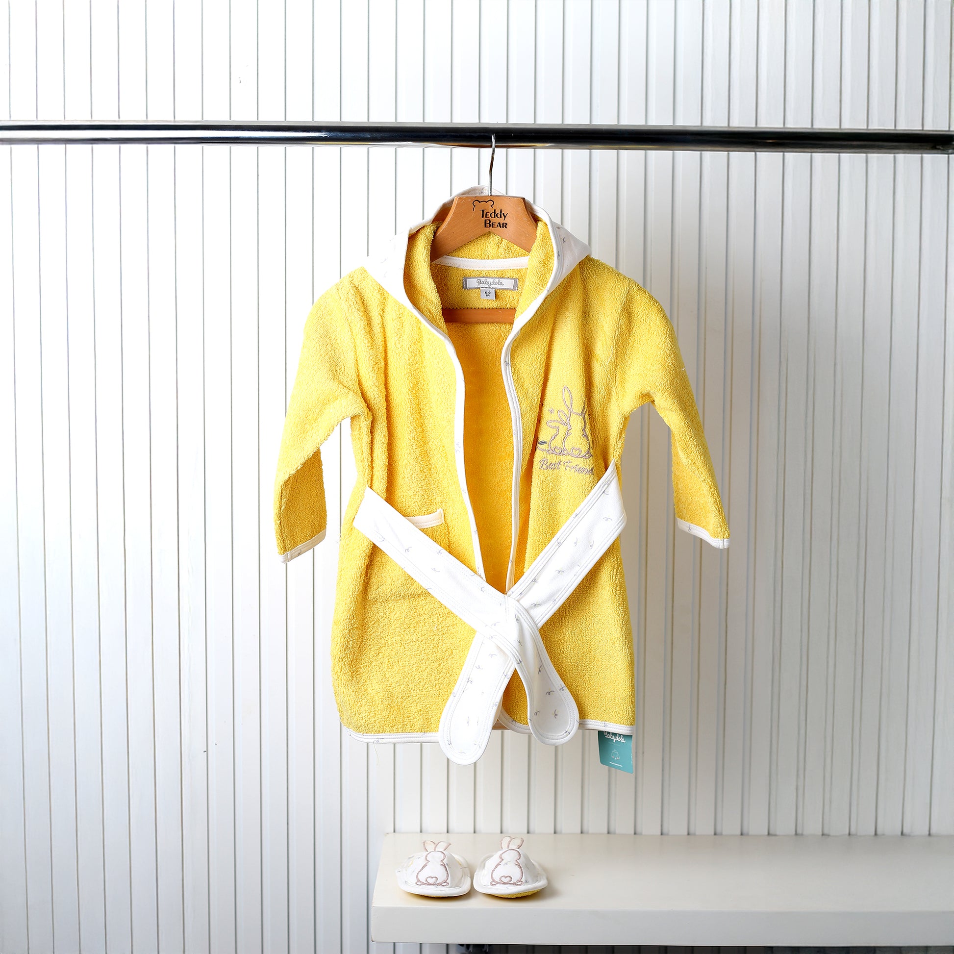 Comfort meets modernity with this bunny-inspired robe. Made from thick ribbed velvet with a lined hood in mint green, it's perfect for after bathing and swimming. It simply fastens with secure tie straps on the sides for safety and includes a shoe to dry baby's feet. Baby Cute Bathrobe